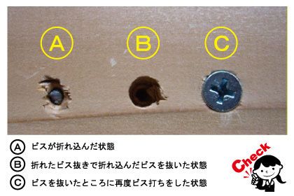 ●ビスを抜き取った穴は損傷が少ないので、再度同じ箇所にビス打ちが可能です。